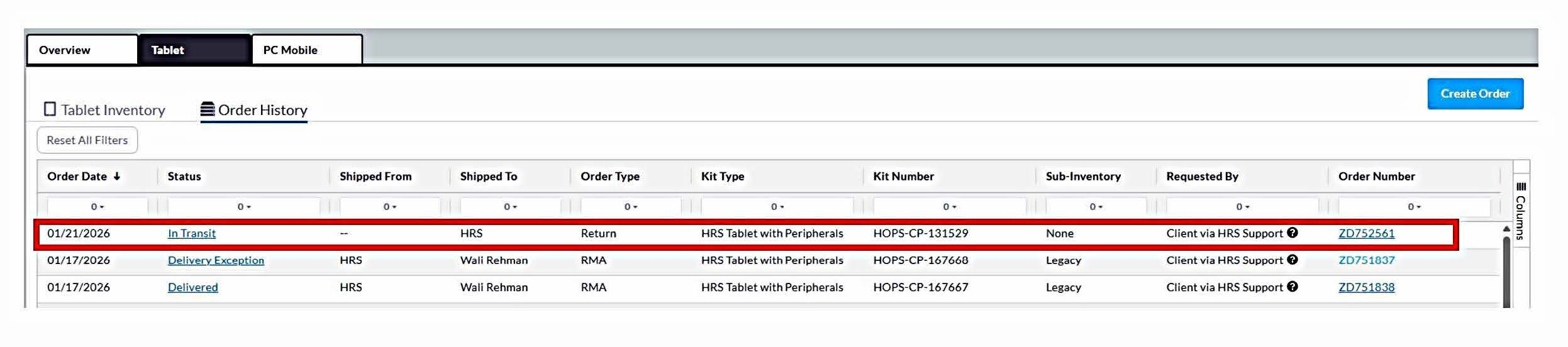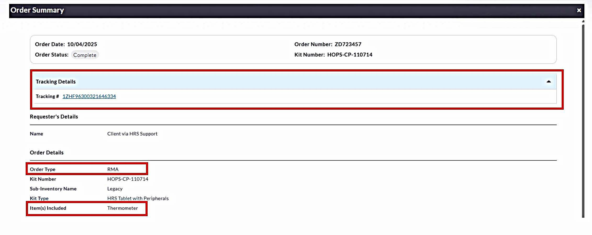 - RMA Orders: These are replacement orders for devices determined by HRS Support after troubleshooting. They are displayed with details such as order type ("RMA"), shipped items, tracking information, and requester details.