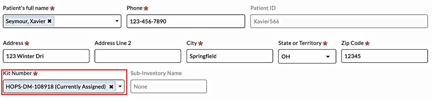 - Order Form Changes: The "Kit Number" field appears only after entering the Requester’s information, Order Type, and Pickup Address. The system automatically loads the kit associated with the patient based on shipping and assignment history. If multiple kits are pending return, clinicians can select one from a dropdown menu. Sub-inventory information loads automatically for organizations with sub-inventories.